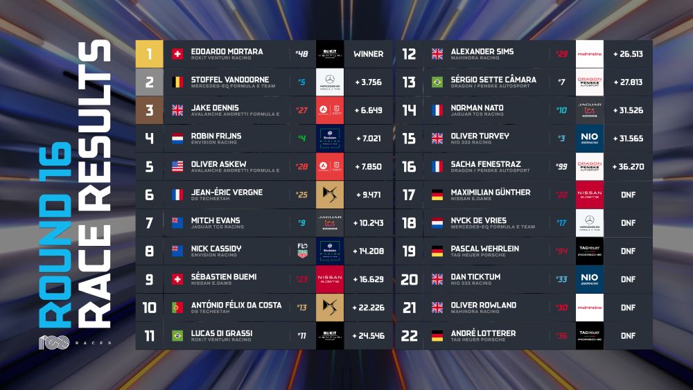 Το βάθρο συμπλήρωσε ο Jake Dennis (Avalanche Andretti). Αναλυτικά η κατάταξη: