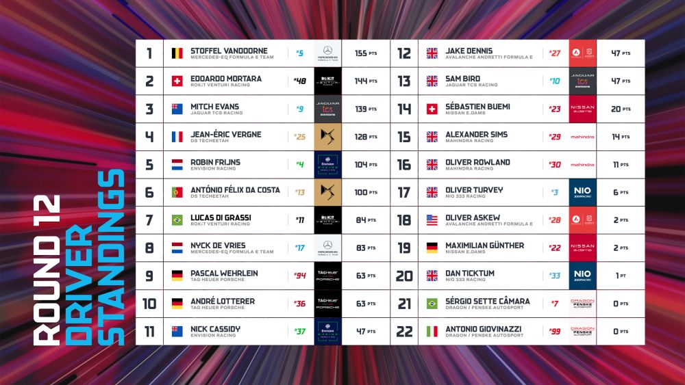Δεύτερος, πίσω από τον πιλότο της DS TECHEETAH, τερμάτισε ο Stoffel Vandoorne της (Mercedes-EQ) που με αυτή τη θέση, πέρασε ξανά πρώτος στην βαθμολογία των οδηγών. Και παράλληλα, οδήγησε τη γερμανική ομάδα στην πρώτη θέση της κατάταξης των κατασκευαστών.