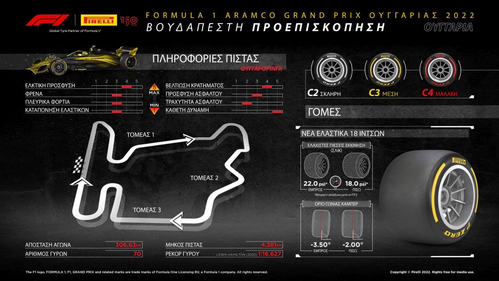 Με το Ουγγρικό Grand Prix φτάνουμε ουσιαστικά στο μέσο της αγωνιστικής περιόδου της Formula 1, αφού ακολουθεί η καλοκαιρινή ανάπαυλα. Για τον αγώνα στο Hungaroring, η Pirelli επέλεξε ελαστικά από το μέσο της γκάμας της: η γόμα C2 είναι η P Zero λευκή/σκληρή, η C3 είναι η P Zero κίτρινη/μέση και η C4 είναι η P Zero κόκκινη/μαλακή γόμα.