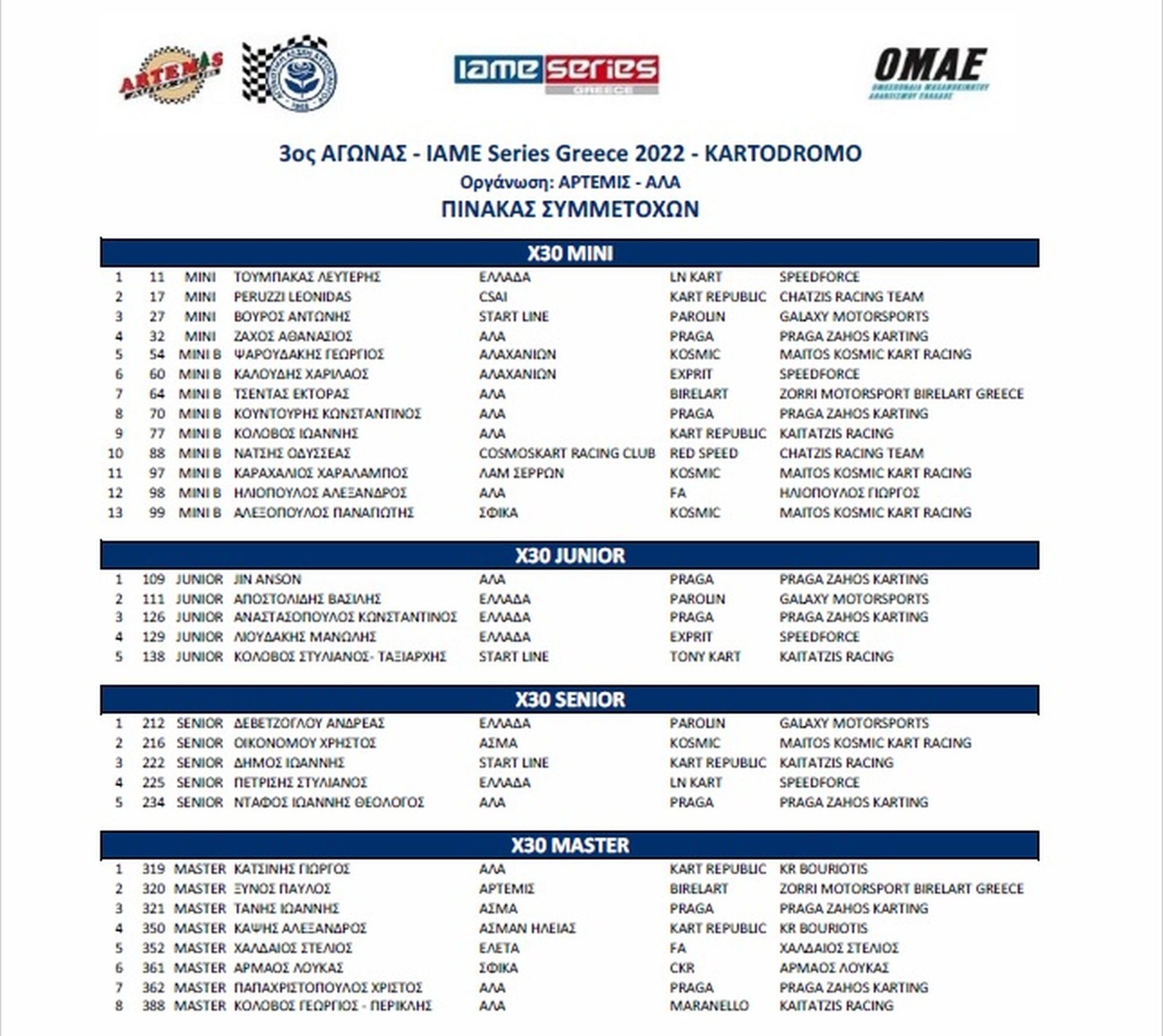 Στην X30 JUNIOR (12-14 ετών) θα διεκδικήσουν τη νίκη 5 αθλητές, ενώ και η X30 SENIOR (από 14 ετών) θα έχει 5 οδηγούς στη σχάρα της εκκίνησης.