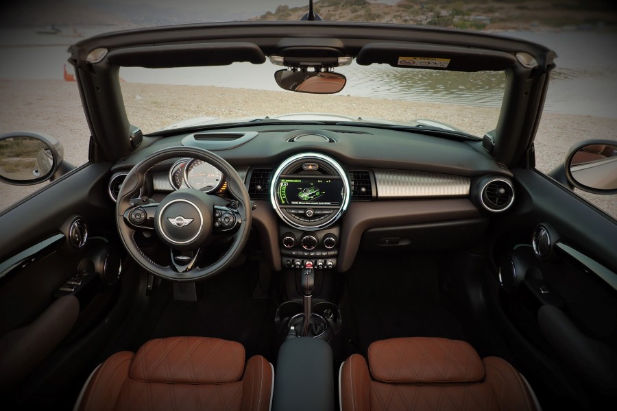 Παράλληλα, «φιλοξενεί» όλες τις απαραίτητες πληροφορίες σχετικά με το αυτοκίνητο, φροντίζει για την πλοήγηση και την ψυχαγωγία των επιβατών με το σύστημα MINI Connected, ενώ σταθερή αξία παραμένουν οι διακόπτες αεροπορικού τύπου στη βάση της κονσόλας, με τον κόκκινο (start button) να κλέβει την παράσταση. Προφανώς και το επίπεδο εξατομίκευσης είναι κορυφαίο, ενώ οι αυξημένες διαστάσεις του MINI, επηρεάζουν θετικά και την cabrio εκδοχή του, προσφέροντας περισσότερο διαθέσιμο χώρο κυρίως για τους εμπρόσθιους -από τους 4 συνολικά- επιβάτες. Να σημειωθεί ότι ο χώρος των αποσκευών αγγίζει τα 215 λίτρα, παρά την προφανή ιδιομορφία λόγω της ανοιγόμενης οροφής που φιλοξενείται εκεί, όταν οι επιβαίνοντες θέλουν να απολαύσουν την εμπειρία ενός cabrio 192 ίππων.