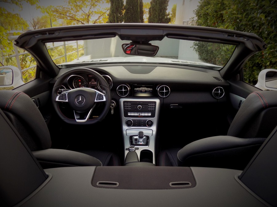 Στο εσωτερικό της, η εικόνα είναι εξίσου θελκτική, με τον εντυπωσιακό πίνακα οργάνων και την έγχρωμη οθόνη των 7 ιντσών στο ταμπλό, η οποία αποτελεί μέρος του συστήματος infotainment που περιλαμβάνει με τη σειρά του δυνατότητες όπως μεταξύ άλλων ψυχαγωγία, πλοήγηση, συνδεσιμότητα, πληροφορίες για το αυτοκίνητο και DVD Player. Η εντός των τειχών ποιότητα παραμένει αδιαπραγμάτευτη, ενώ ο εξοπλισμός προσαρμόζεται ανάλογα με τα γούστα του υποψήφιου αγοραστή. Σε ότι αφορά στους χώρους της διθέσιας καμπίνας δεν είναι αμελητέοι, με την υποσημείωση ότι χρειάζονται κάποιες μικρές παραχωρήσεις κατά την είσοδο ατόμων με ύψος πάνω από 1,80 μ., καθώς τα καθίσματα βρίσκονται χαμηλά. Από την άλλη, ο χώρος αποσκευών των 335 λίτρων αποτελεί δυνατό χαρτί για ένα μοντέλο της κατηγορίας της SLC.