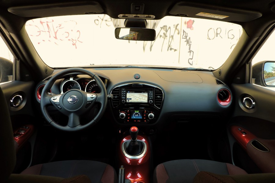 Το εσωτερικό του δεν θα μπορούσε να έχει διαφορετική ή ασύμβατη εικόνα με την εξωτερική εμφάνιση του Juke, με τις καμπύλες να κυριαρχούν, τις πρωτοτυπίες να ρέουν άφθονες και την κεντρική κονσόλα να κλέβει την παράσταση, χάρη στον εντυπωσιακό τρόπο με τον οποίο πραγματοποιούνται οι εναλλαγές των πληροφοριών. Η ποιότητα των πλαστικών που έχουν χρησιμοποιηθεί είναι αρκούντως καλή, όπως και η ανθεκτικότητα τους. Ο πίνακας οργάνων είναι ευανάγνωστος, ενώ η γενικότερη αίσθηση που έχει ο οδηγός είναι ότι βρίσκεται σε ένα σπορ αυτοκίνητο, παρά σε κάτι πιο… οικογενειακό. Τέσσερις επιβάτες θα φιλοξενηθούν με άνεση στην καμπίνα του Juke, με τους πίσω πιθανόν να χρειαστούν μερικές «παραχωρήσεις» εάν είναι κάπως ψηλοί, ενώ ένας πέμπτος απαιτεί συμβιβασμούς. Σε ότι αφορά στον χώρο των αποσκευών, τα 354 λίτρα της χωρητικότητας του (από τα 251 προ facelift, ήτοι αύξηση 40% περίπου) κρίνονται άκρως ικανοποιητικά.