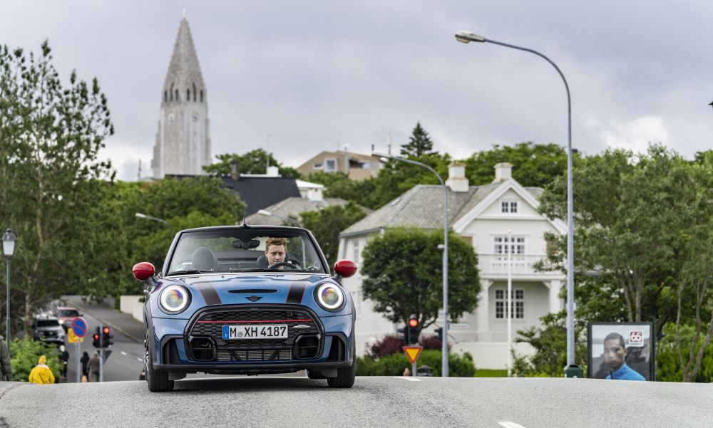 Οι δρόμοι του Ρέικιαβικ από την άλλη, είναι εντυπωσιακά πολύχρωμοι. Για να μπορούν να ανταπεξέρχονται τους σκοτεινούς χειμερινούς μήνες με καλή διάθεση μέχρι την άφιξη της πιο φωτεινής καλοκαιρινής περιόδου, οι φιλικοί κάτοικοι της πρωτεύουσας απαντούν στο μουντό, μελαγχολικό καιρό με ένα πολύχρωμο σκηνικό από έντονα βαμμένα σπίτια Σκανδιναβικής σχεδίασης. Είναι ένα σκηνικό που ταιριάζει ιδανικά στο MINI John Cooper Works Cabrio με το μεταλλικό του φινίρισμα σε Island Blue. Η μινιμαλιστική σχεδιαστική γλώσσα προσελκύει την προσοχή σε τυπικά χαρακτηριστικά στοιχεία του MINI, όπως η εξαγωνική μάσκα και οι στρογγυλοί προβολείς. Τα πίσω φώτα στο μοτίβο της βρετανικής σημαίας (Union Jack) παραπέμπουν διακριτικά στις Βρετανικές ρίζες της μάρκας.