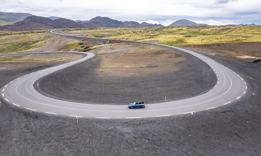 Στην ξηρά, προς τα ανατολικά του Ρέικιαβικ, τα πράγματα αρχίζουν να αγριεύουν. Μετά από σύντομη οδήγηση στον Ισλανδικό Ring Road “1”, στρίβετε δεξιά στον ‘36’ με κατεύθυνση το Mosfellsbær. Η διαδρομή είναι γεμάτη στροφές και φουρκέτες δίνοντας την ευκαιρία στο MINI John Cooper Works Cabrio να ξεδιπλώσει το εκρηκτικό ταπεραμέντο του. Ωστόσο, το όριο ταχύτητας των 90 km/h στην Ισλανδία σας επιτρέπει να πάρετε μόνο μία μικρή γεύση από τις δυνατότητες του 4κύλινδρου turbo κινητήρα των 170 kw/231 hp αυτού του εξαιρετικά σπορ τετραθέσιου.