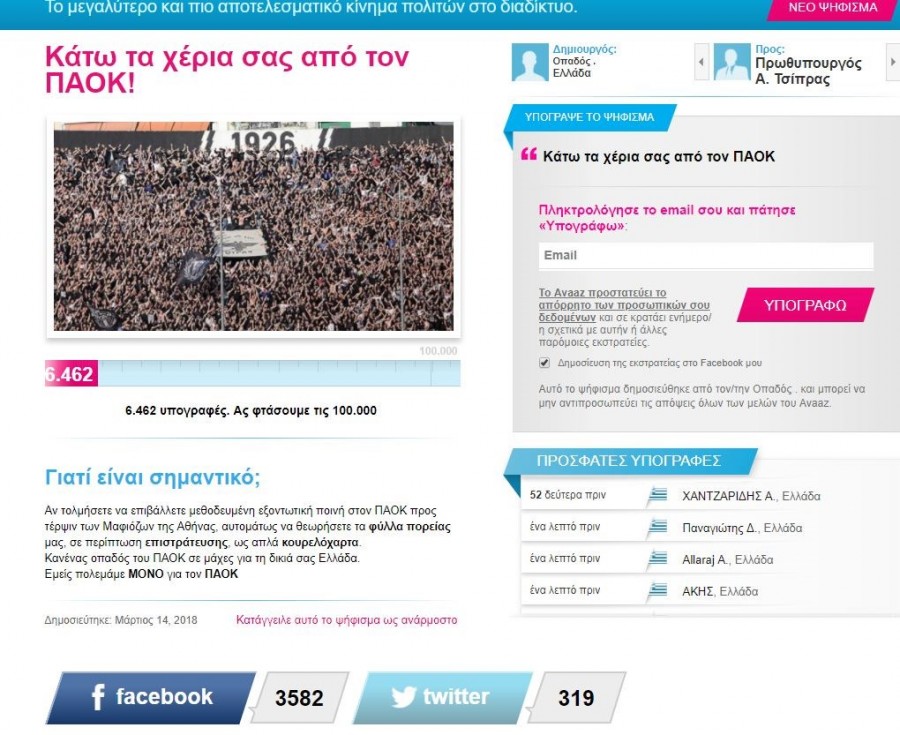 «Αν τολμήσετε να επιβάλλετε μεθοδευμένη εξοντωτική ποινή στον ΠΑΟΚ να θεωρήσετε τα φύλλα πορείας μας, σε περίπτωση επιστράτευσης, ως απλά κουρελόχαρτα», δηλώνουν οπαδοί του ΠΑΟΚ μέσω ψηφίσματος στην διεθνή διαδικτυακή πλατφόρμα Avaaz.org και προσθέτουν: