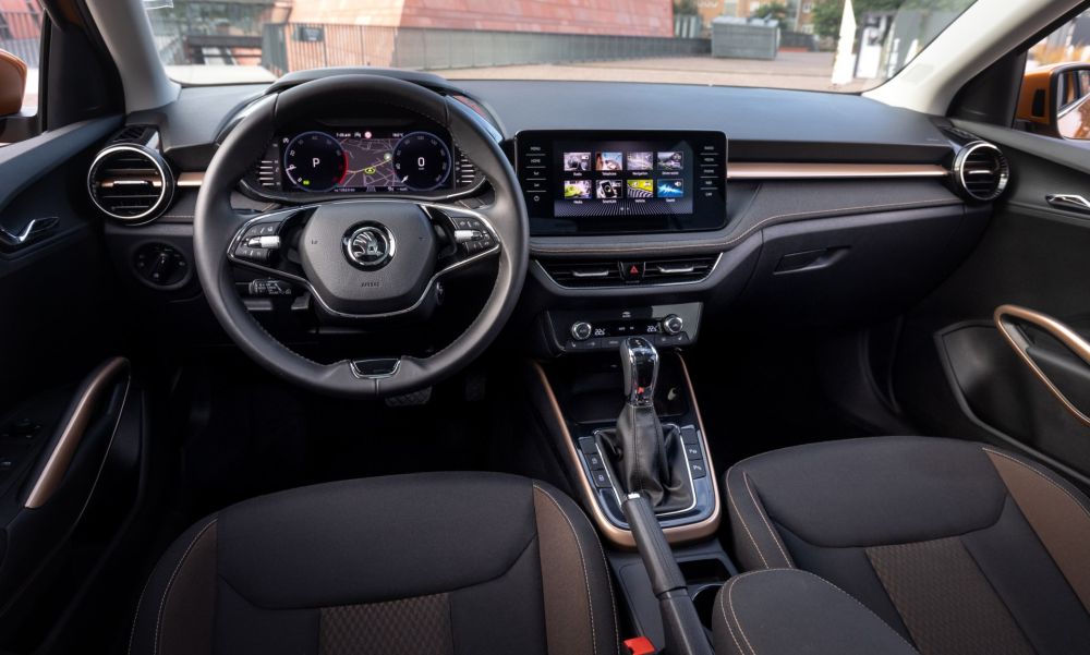 Περνώντας στη καμπίνα λοιπόν, συμμετρικά σχεδιασμένος πίνακας οργάνων μαζί με την ανεξάρτητη κεντρική οθόνη και την οριζόντια διακοσμητική επένδυση τονίζουν το πλάτος του εσωτερικού και ενισχύουν την αίσθηση ευρυχωρίας.