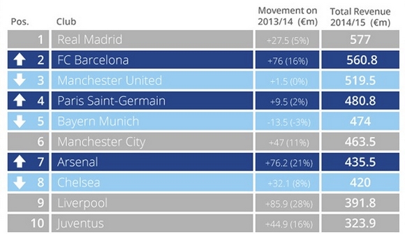 Όπως σημειώνει η Deloitte, είναι η πρώτη φορά στην ιστορία που οι πρώτες τρεις ομάδες έχουν ξεπεράσει τα 500.000.000 ευρώ, με τη Ρεάλ Μαδρίτης να έχει 577.000.000, τη Μπαρτσελόνα που βρίσκεται στη δεύτερη θέση να έχει 560.800.000 και τη Μάντσεστερ Γιουνάιτεντ, που έχασε μια θέση (πλέον είναι 3η), να έχει 519.500.000.