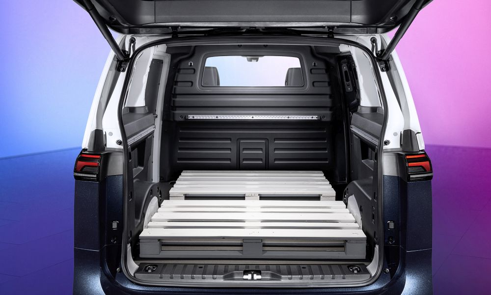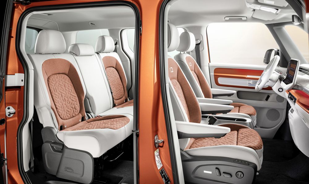 Φιλοσοφία ανοιχτού χώρου Οι οδηγοί και οι επιβάτες του ID. Buzz βιώνουν τη νέα αίσθηση Bulli σε ένα εσωτερικό που έχει σχεδιαστεί με τη φιλοσοφία του ανοιχτού χώρου (open space). Στη φιλική ατμόσφαιρα της πενταθέσιας έκδοσης MPV, πέντε άτομα έχουν άφθονο χώρο για ταξίδια και αντίστοιχα για τις αποσκευές τους (χωρητικότητα έως 1.121 λίτρα). Εάν η δεύτερη σειρά καθισμάτων αναδιπλωθεί, ο χώρος φόρτωσης αυξάνεται στα 2.205 λίτρα. Μεσοπρόθεσμα, θα ακολουθήσει επίσης εξαθέσια και επταθέσια διαμόρφωση με μεγαλύτερο μεταξόνιο. Τρεις θέσεις μπροστά (εναλλακτικά δύο) και ένα σταθερό χώρισμα για τον 3,9 κ.μ. χώρο αποσκευών είναι, εν τω μεταξύ, διακριτικά χαρακτηριστικά της διαμόρφωσης του ID. Buzz Cargo. Το Van μηδενικών εκπομπών ρύπων μπορεί να μεταφέρει δύο ευρωπαλέτες στο πίσω μέρος.