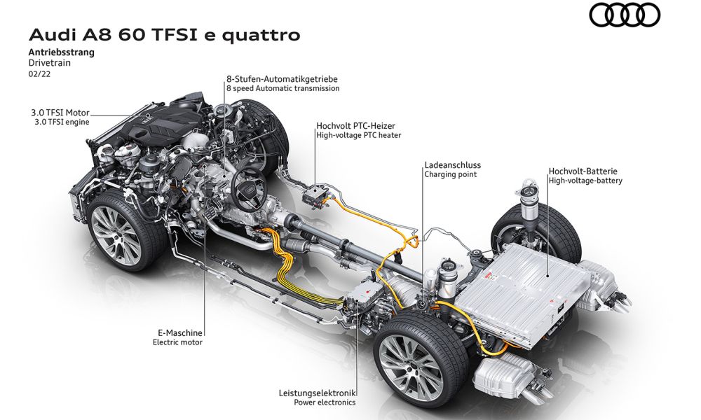 Το Audi A8 60 TFSI e quattro είναι το plug-in υβριδικό μοντέλο (PHEV) της γκάμας, με έναν compact ηλεκτροκινητήρα να υποστηρίζει τον 3.0 TFSI. Η μπαταρία ιόντων λιθίου στο πίσω μέρος μπορεί τώρα να αποθηκεύσει καθαρά 14,4 kWh (μεικτό: 17,9 kWh) ενέργειας. Με ισχύ συστήματος 462 PS (340 kW) και ροπή 700 Nm, το Audi A8 60 TFSI e quattro επιταχύνει από στάση στα 100 χλμ./ώρα σε 4,9 δευτερόλεπτα.