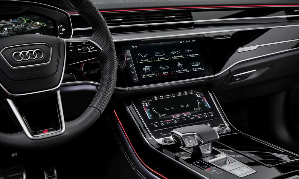 Η Audi έχει εξοπλίσει το νέο A8 με τις πιο σύγχρονες τεχνολογίες χειρισμού: Audi virtual cockpit, head-up display επαυξημένης πραγματικότητας, έλεγχος απόκρισης αφής MMI, με δύο οθόνες (10,1” και 8,6”) και φυσικός φωνητικός έλεγχος. Το στάνταρ MMI Navigation plus τρίτης γενιάς (MIB 3) υποστηρίζει υπηρεσίες Car-2-X. Δύο οθόνες 10,1” με ανάλυση Full HD, είναι προσαρτημένες στην πλάτη των μπροστινών καθισμάτων και σε συνδυασμό με προηγμένο σύστημα ήχου Bang & Olufsen με ενισχυτή 1.920 Watt και 23 ηχεία, φροντίζουν για τη ψυχαγωγία οδηγού και επιβατών.