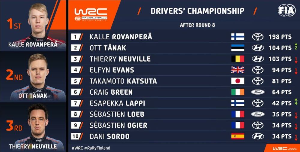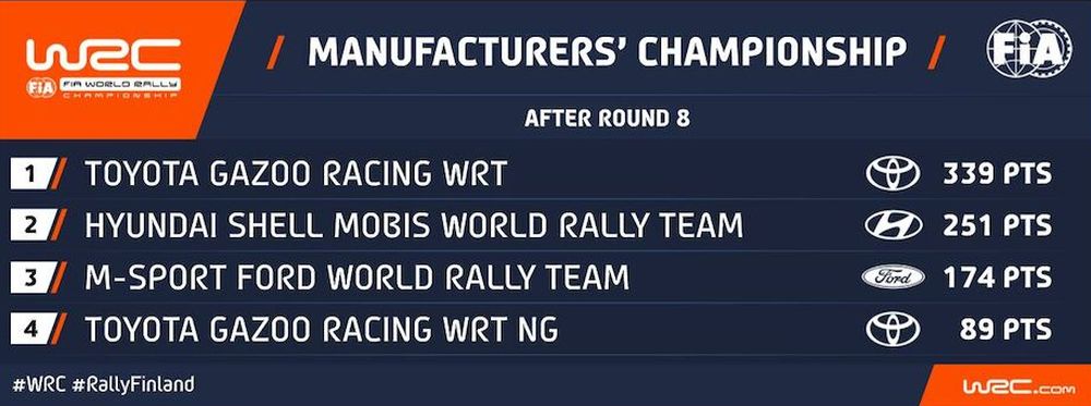 Όσο για τον πρωτοπόρο της βαθμολογίας, δεν χρειαζόταν να πάρει ρίσκα. Πήρε τη δεύτερη θέση και μαζί με τους 18 βαθμούς που χαρίζει αυτή, πήρε και τους 5 για τον καλύτερο χρόνο στην power stage. Έτσι έχει πλέον προβάδισμα 94 βαθμών, με μόνο πέντε ράλλυ να απομένουν για την ολοκλήρωση της σεζόν!