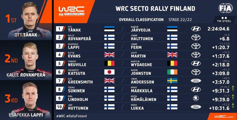 O Ott Tanak πανηγύρισε τη νίκη στο Ράλλυ Φινλανδίας, όγδοο γύρο του φετινού Παγκοσμίου Πρωταθλήματος! Σε μία συναρπαστική κόντρα υψηλών ταχυτήτων, σε ένα σταθμό που χαρακτηρίζεται ως το «Grand Prix» των ράλλυ. Τέρμα γκάζι, με πολλά άλματα και ατελείωτο θέαμα. Και πίσω από αυτά, τα οποία βλέπουν και απολαμβάνουν οι θεατές, έχουμε και την ουσία.