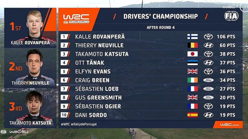 Και πίσω τους, είναι 4 οδηγοί από τους 38 έως τους 34 πόντους. Τρίτος στη βαθμολογία είναι ο Takamoto Katsuta της Toyota με 38 πόντους, παρότι στην Πορτογαλία ηττήθηκε στο φώτο-φίνις από τον Dani Sordo της Hyundai που έκανε την πρώτη φετινή εμφάνισή του.