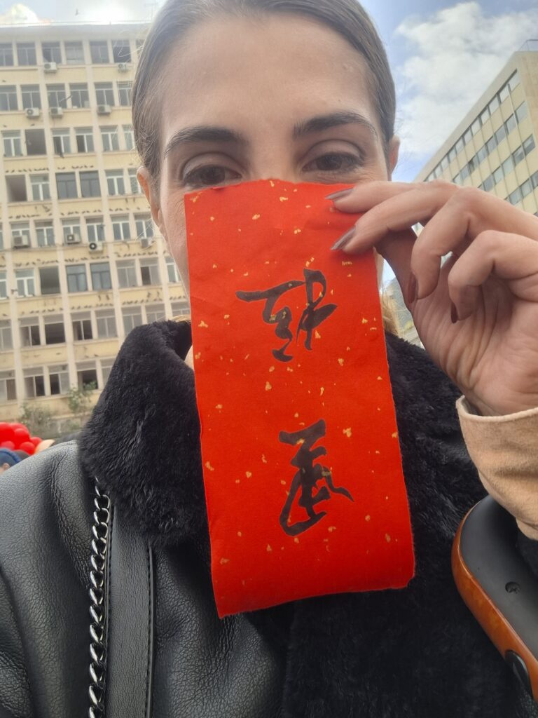 Μετά στάθηκα στην ουρά για να μου γράψει ένας γλυκύτατος κύριος το όνομά μου στα κινεζικά πάνω σε χαρτί. Σ’ αυτό το περίπτερο γινόταν ο κακός χαμός. Σταματούσε μέχρι και ο παππούς συνταξιούχος που έτυχε να περνάει από την Κοτζιά, είδε και μπήκε για να γράψει κι αυτός το όνομά του στα κινεζικά. Σας μιλώ ειλικρινά, η ουρά είχε τα πάντα όλα από ηλικίες, είχε φοιτητές, οικογένειες με καρότσια, κυρίες με γούνες και παππούδες που δεν είχαν ιδέα τι ακριβώς συμβαίνει αλλά ήθελαν να δούνε το όνομα τους γραμμένο με ιδεογράμματα.