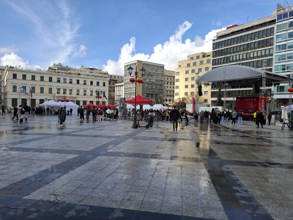 Η Κοτζιά είναι από εκείνες τις πλατείες που τις έχεις συνδέσει με διαδηλώσεις, περιστέρια και ραντεβού «μπροστά από το Δημαρχείο». Και ξαφνικά, μπαμ: κόκκινο παντού. Κόκκινα φαναράκια να αιωρούνται, χρυσές λεπτομέρειες, ένας δράκος που ετοιμαζόταν να ξεδιπλωθεί σαν τεράστιο μεταξωτό φίδι. Έχει μια ιδιαίτερη γοητεία να βλέπεις μια από τις πιο κλασικά ελληνικές πλατείες να ντύνεται με σύμβολα μιας άλλης, πανάρχαιας κουλτούρας. Είναι σαν να συναντιούνται δύο παλιοί πολιτισμοί για καφέ στο κέντρο.