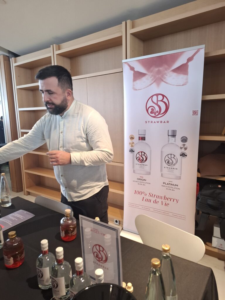 Σε άλλο περίπτερο, μου τραβάει την προσοχή μια επωνυμία που δεν ακούγεται ελληνική: Strawbar. Και όμως, πρόκειται για μια νέα οινοποιεία από τη Φλώρινα, με επίκεντρο τη φράουλα και μάλιστα μια συγκεκριμένη ποικιλία που ευδοκιμεί στην περιοχή. Παράγουν αποστάγματα φράουλας και, ανάμεσά τους, ένα παλαιωμένο απόσταγμα, το πρώτο παγκοσμίως. Εκεί καταλαβαίνεις πόσο μακριά μπορεί να φτάσει η φαντασία όταν συναντά τη γνώση.