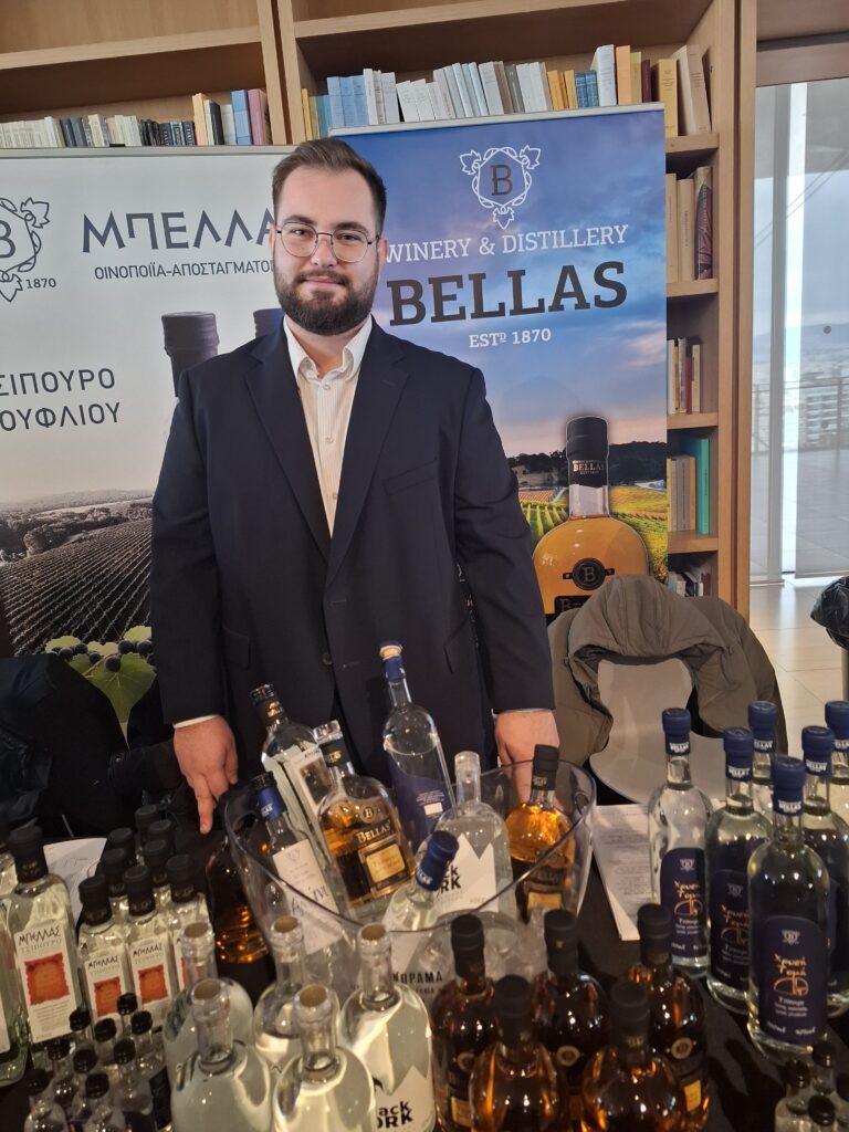 Στο περίπτερο της οινοποιίας Μπέλλα, με ιστορία που ξεκινά το 1870 από προπάππου της οικογένειας, ο Γιάννης Μπέλλας μου δίνει να δοκιμάσω ένα νέο απόσταγμα οίνου, λίγο πριν κυκλοφορήσει στην αγορά. Πρόκειται για blend από διάφορα κρασιά, ανάμεσά τους και δύο μοναδικές ποικιλίες παγκοσμίως που καλλιεργούνται στο Σουφλί. Το αποτέλεσμα είναι ένα ποτό με ήπια γεύση, μακρά επίγευση και φινετσάτα αρώματα, διακριτικό, αλλά με χαρακτήρα.