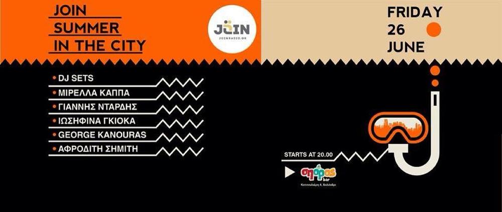 Την Παρασκευή 26 Ιουνίου το Join radio έρχεται να δροσίσει ακόμη περισσότερο την όαση που λέγεται Σπόρος. Μαζεύει παραγωγούς του, μαζεύει φίλους του, βρίσκει και άλλους φίλους εκεί και γίνονται όλοι μια παρέα ακούγοντας super μουσική και πίνοντας super . Τα βράδια του καλοκαιριού τα σηκώνουν αυτά τα super. Μέτρα λοιπόν, Γιάννης Ντάρδης, Μιρέλλα Κάππα, George Kanouras, Ιωσηφίνα Γκιόκα και Αφροδίτη Σημίτη αναλαμβάνουν τα decks του Σπόρου για μία βραδιά που θέλει παπούτσια για χορό. Παπούτσια για χορό, το διάβασες, μη λες μετά δεν ήξερες. Παρασκευή 26 Ιουνίου, Join Summer in the City Party! Σπόρος bar, Κατσουλιέρη 4, Χαλάνδρι. Μετά τις 20:00
