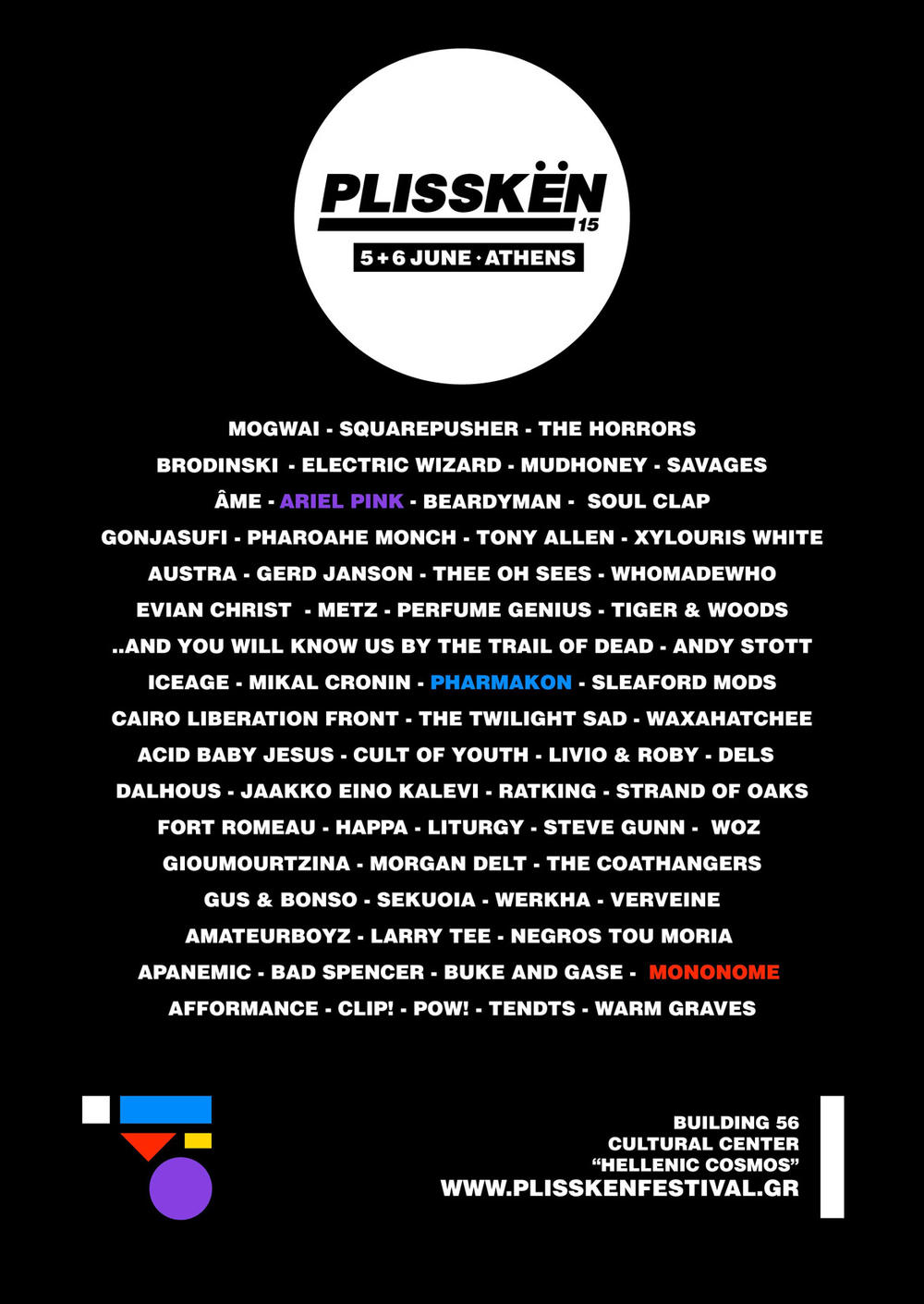 64 καλλιτέχνες, ψέματα, 64 σχήματα θα εμφανιστούν στις δύο μέρες του φετινού Plissken festival. Ονόματα με μεγάλη ιστορία όπως οι Mudhoney, ο Pharoahe Monch, ο Tony Allen, οι Mogwai, ο Squarepusher, οι Ame, ο Oxia, θα βρεθούν δίπλα σε ανερχόμενους και λιγότερο γνωστούς καλλιτέχνες που ξεχωρίζουν με την ιδιαίτερη παρουσία τους όπως ο Perfume Genius, οι Savages, οι The Horrors και δεκάδες άλλοι.