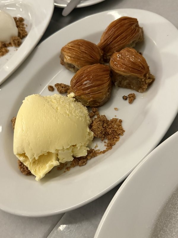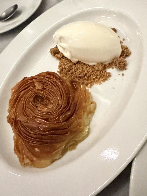 Το λουκάνικο ήταν πολύ καλής ποιότητας και το ψήσιμο του συκωτιού εξαιρετικό, ενώ η γραβιερόπιτα σου έβγαζε μια σπιτική θαλπωρή και νοστιμιά. Τα γλυκά ήταν απίθανα και εξαιρετικά, ειδικά το κάτι σαν μπακλαβαδάκι και το γαλακτομπούρεκο! Η παρέα τρελάθηκε με το γλυκο-αλμυρό μιλφέιγ (βασικά το έβαζε πρώτο), αλλά εγώ έχω αγάπη στο γαλακτομπούρεκο.