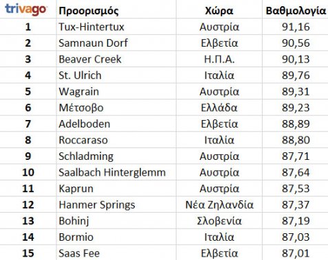 Μπορεί την πλειοψηφία των θέσεων να κατέκτησαν οι αυστριακοί και ελβετικοί προορισμοί, παρόλα αυτά κατάφεραν 6 ελληνικοί προορισμοί να μπουν στη λίστα και μάλιστα σε υψηλές θέσεις. Η κατάταξη περιέχει προορισμούς, που είτε διαθέτουν χιονοδρομικό κέντρο, είτε βρίσκονται σε απόσταση αναπνοής.