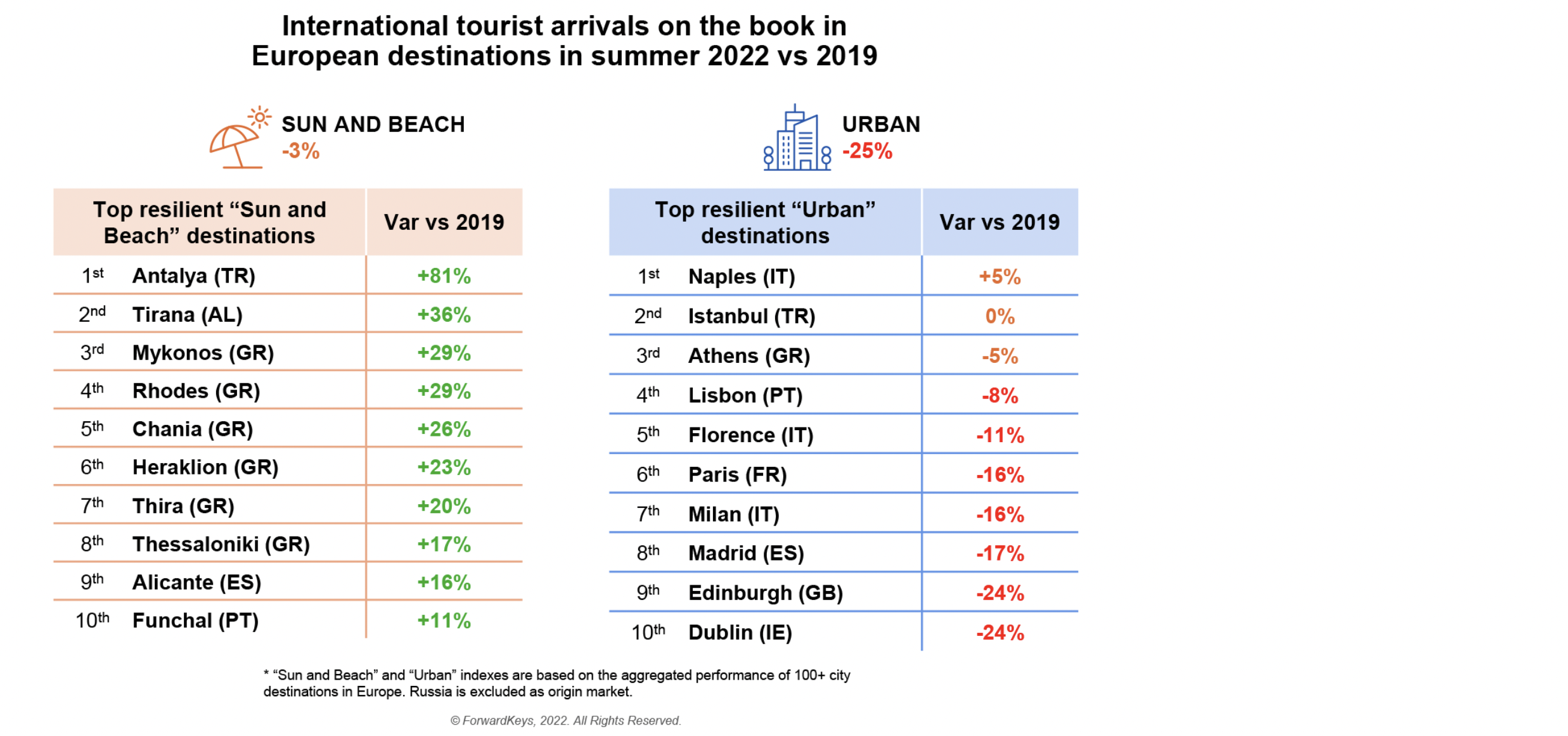 Αντίστοιχα και η θέση της Αθήνας στο πίνακα που αφορά τις πόλεις της Ευρώπης είναι πολύ θετικοί καθώς βρίσκεται στην 3η θέση με μόλις 5% πτώση από την εξαιρετική χρονιά του 2019 και στην πρώτη θέση βρίσκεται με θετικό πρόσημο 5% .