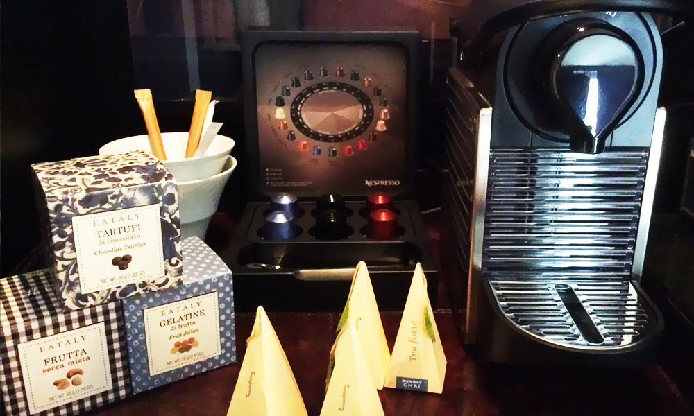 Όλη η διαρρύθμιση σε κάνει να μην θες να βγεις από το δωμάτιο, ανοίγω την ντουλάπα και τοποθετώ το σακάκι μου σε μια κρεμάστρα `Zoo` και διακρίνω το μπουρνούζι με κεντημένο το λογότυπο του ξενοδοχείου καθώς και το μικρό και με σύστημα αφής χρηματοκιβώτιο. Δίπλα ακριβώς είναι το έπιπλο με την Nespresso μηχανή και όλα τα συνοδευτικά, τσάι σε πολλές γεύσεις, ξηροί καρποί της ιταλικής εταιρείας `Eataly` (Τα πρώτα που δοκίμασα & πεντανόστιμοι!). Το mini bar διαθέτει ότι μπορεί να χρειαστείς μέχρι και ποτά σε περίπτωση που θες να πνίξεις κάποιον πόνο…τις κρύες – και όχι μόνο – νύχτες του Βερολίνου.