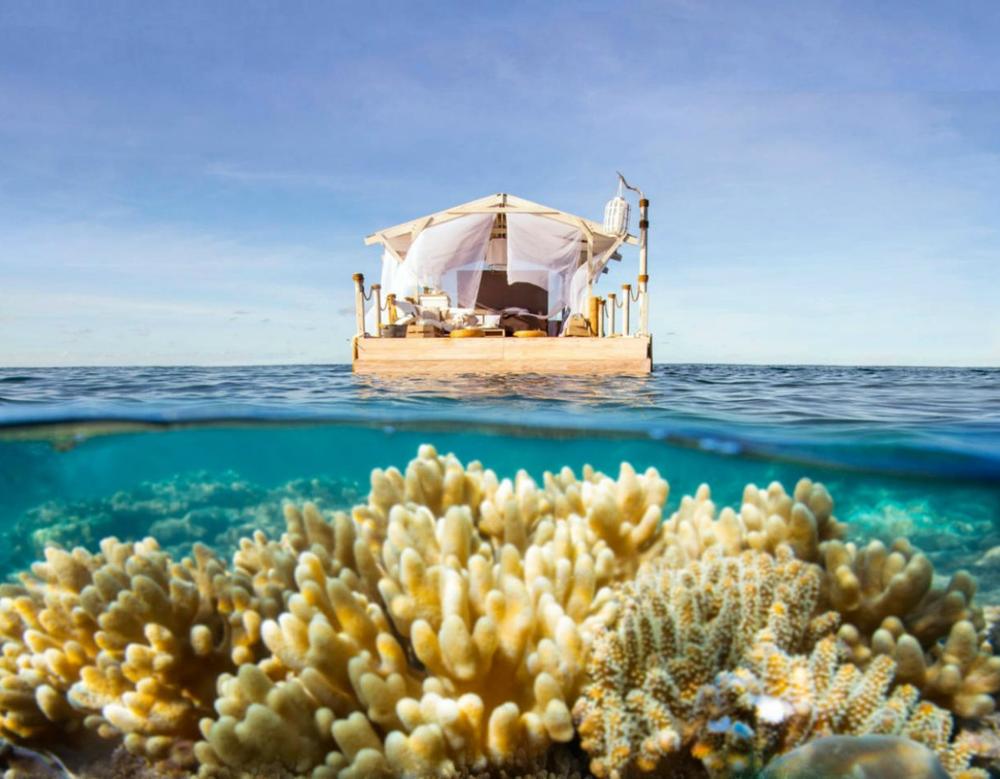 Το ειδικά κατασκευασμένο πλωτό κατάλυμα θα πλέει πάνω από τον Μεγάλο Κοραλλιογενή Ύφαλο στα ανοικτά των ακτών της Κουινσλάνδης, στην Αυστραλία. Διαθέτει δύο κρεβατοκάμαρες, κουζίνα και καθόλου τοίχους ώστε οι φιλοξενούμενοι να νανουριστούν από τον ήχο των κυμάτων και να τους ξυπνήσει ο ήλιος. Όσον αφορά το γεύμα, που θα απολαύσουν, θα είναι από τα χέρια του Αυστραλού σεφ, Neil Perry.