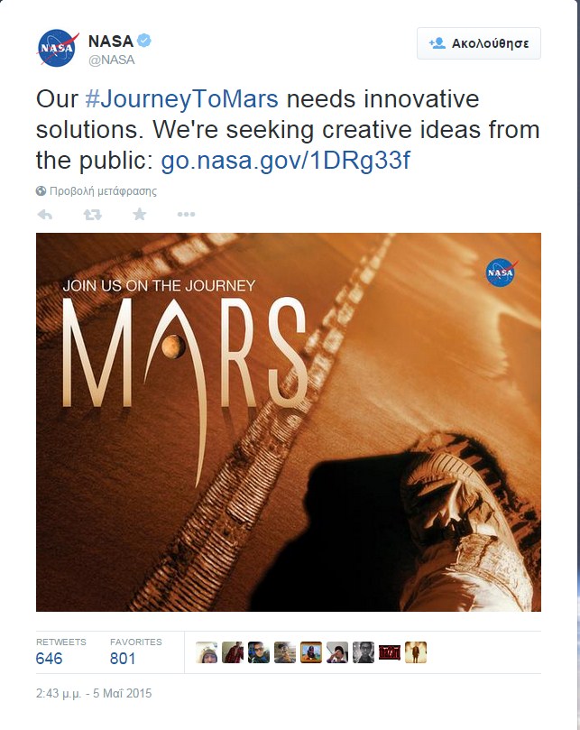 Μπορεί για τον John Gray* να είναι η ιδιαίτερη πατρίδα του ανδρικού φύλου, αλλά οσονούπω θα γίνει η γη της επαγγελίας για το ανθρώπινο είδος. Ή τουλάχιστον σε αυτό ελπίζει (;) η NASA η οποία ανακοίνωσε μέσα από το Twitter της ότι το #Ταξίδι στον Άρη χρειάζεται καινοτόμες ιδέες. Ψάχνουν δημιουργικές ιδέες από τον «απλό κοσμάκη» και αν είστε ένας από αυτούς με τις πολλές ιδέες μπορείτε να τους βοηθήσετε μπαίνοντας στο site τους.
