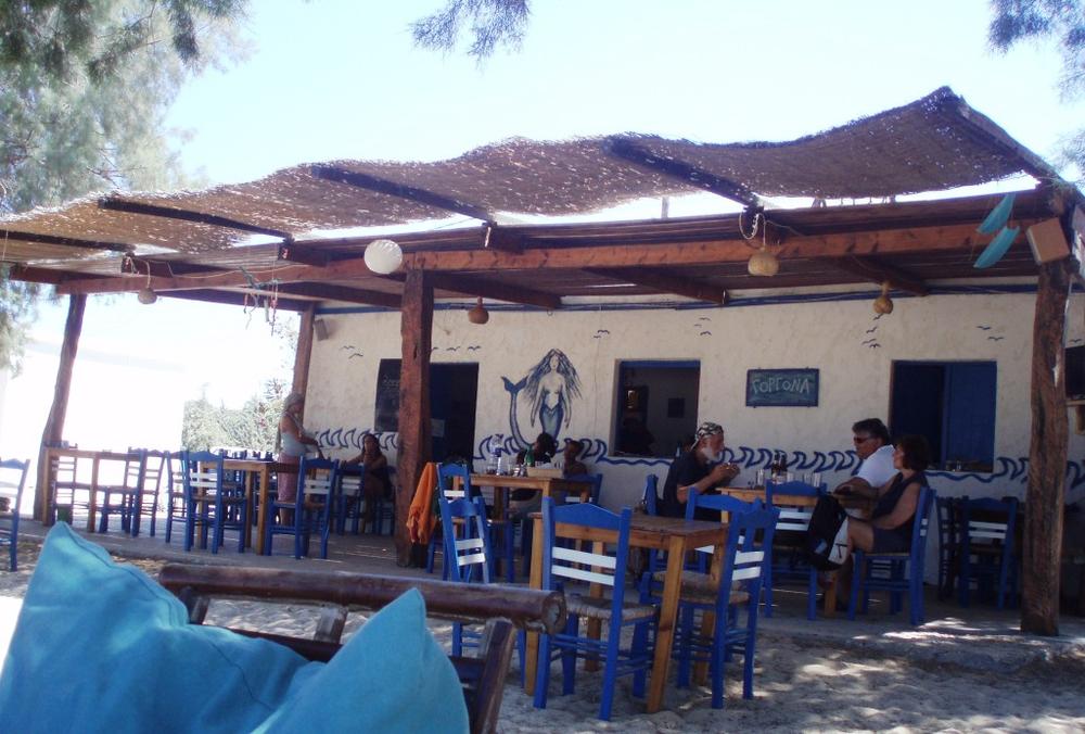 Γύρω μας, πρέπει να υπήρχαν συνολικά 6-7 ταβέρνες και καφετέριες. Εγκατασταθήκαμε στην Γοργόνα, ένα εναλλακτικό beach bar, στην αριστερή πλευρά της παραλίας, υπό τους ήχους του Cafe del Mar. Το ζευγάρι που είχε την Γοργόνα, ήταν στην ηλικία μας. Είχαν βαρεθεί τη ζωή τους στην Αθήνα και αποφάσισαν να ζουν τους περισσότερους μήνες του χρόνου εδώ. Είχαν φτιάξει μόνοι τους όλο το μαγαζί, ακόμα και τις μεγάλες πολυθρόνες από ξύλινα τελάρα στις οποίες καθόμασταν όλες τις επόμενες μέρες για πρωινό, μεσημεριανό, μεζέδες, ποτό.