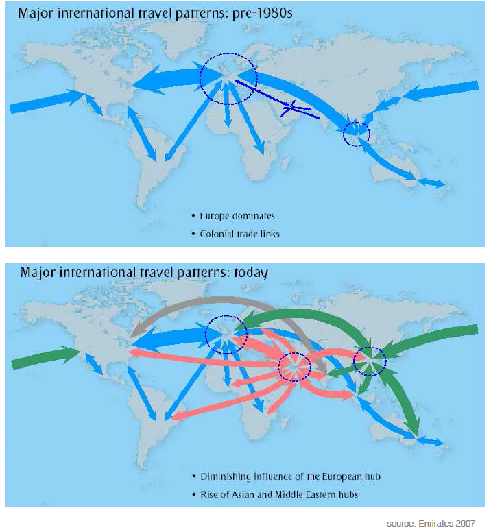 1) Γεωγραφικά χαρακτηριστικά. Το Dubai βρίσκεται σε ένα στρατηγικό σημείο πάνω στον βασικό άξονα Ευρώπης – Ασιας – Αυστραλιας, που είναι και η αεροπορική αγορά με τη μεγαλύτερη αύξηση τα τελευταία χρόνια λόγω της ραγδαίας ανάπτυξης των οικονομίων σε Κίνα , Ινδία , Αυστραλία και νοτιοδυτική Ασία. Ετσι το Dubai βρίσκεται σε απόσταση 4 ωρών πτήσης από το 1/3 του παγκόσμιου πληθυσμού και σε 9 ώρες από το επόμενο 1/3 , καλύπτοντας όλη την Αφρική την Κίνα και την Ινδία. Αυτό κάνει το Dubai τον Ιδανικό κόμβο μετακινήσεων μεταξύ των ανεπτυγμένων οικονομιών της Δύσης με τις ραγδαία αναπτυσόμενες οικονομίες της Ανατολής.