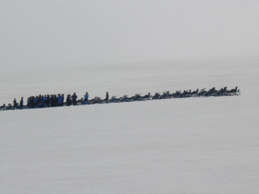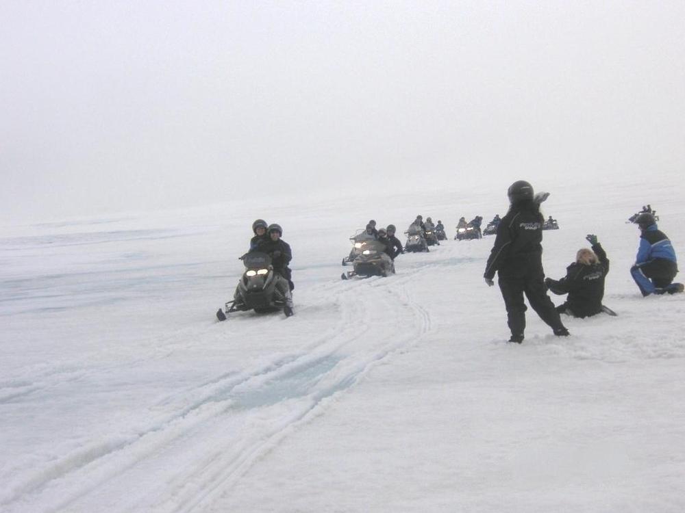Το μέρος που είχαμε παρκάρει και που βρισκόταν το σπιτάκι δεν είχε οπτική πρόσβαση στον παγετώνα – ακόμα δεν είχαμε δει τίποτα. Εν μέσω γέλιων και αλληλοκοροϊδιών για το κωμικό των στολών μας, φύγαμε πεζή για τον παγετώνα. Ήταν πολύ περίεργο: εκεί που σταματούσε το χώμα, άρχιζε ο πάγος. Έτσι, ξαφνικά. Αφού κάναμε μια εκπαίδευση-αστραπή σχετικά με το πώς θα χρησιμοποιούμε τα snowmobile, που συνοψιζόταν κυρίως στο ότι δεν πατάμε απότομα γκάζι ή φρένο, κι ότι ακολουθούμε ευλαβικά το convoy, καβαλήσαμε τις χιονομηχανές με προορισμό… εκεί στο βάθος.