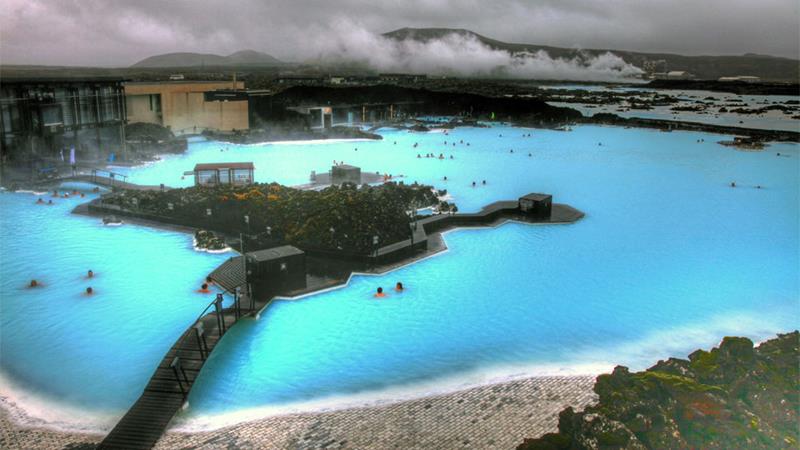 γεωθερμικό spa και περιτριγυρίζεται από ένα τοπίο μαύρης λάβας.