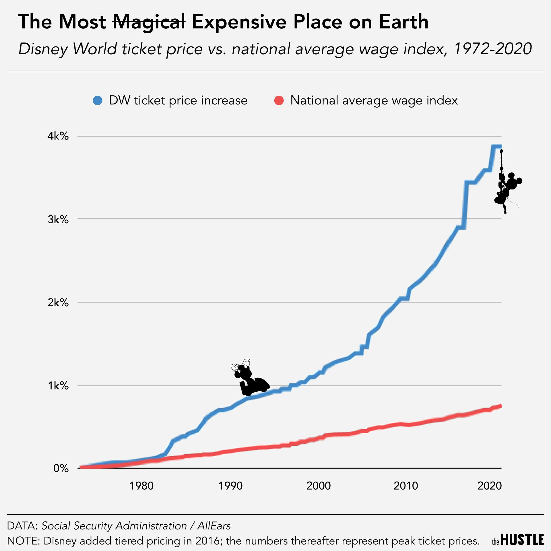 Τα πράγματα όμως κάθε χρόνο από τότε άλλαζαν προς το χειρότερο οικονομικά. Έτσι κάθε χρόνο υπήρχε μία συνεχή αύξηση της τιμής εισόδου δικαιολογούμενη από την προσθήκη νέων θεματικών ενοτήτων στο πάρκο, φτάνοντας στις μέρες μας το εισιτήριο της εισόδου να κοστίζει 200 δολάρια, δηλαδή μία τετραμελή οικογένεια θα χρειαστεί σχεδόν 800 δολάρια για την είσοδό τους. Η εξωφρενική αυτή αύξηση φαίνεται ακόμη πιο υπερβολική όταν την συγκρίνει κάποιος με την αύξηση του εισοδήματος της μέσης οικογένειας τα 40 αυτά χρόνια που είναι μη συγκρίσιμη.