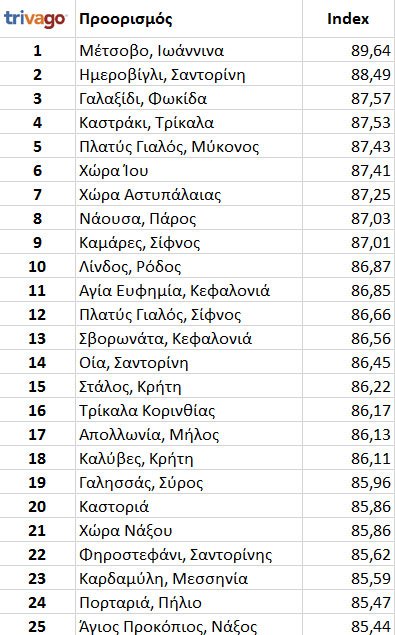 Η Trivago εξέτασε τους ελληνικούς προορισμούς, βαθμολόγησε τα ξενοδοχεία τους και δίνει τώρα στη δημοσιότητα τη λίστα. Την πρωτιά, προς έκπληξη όλων, δεν κατακτά κάποιο ελληνικό νησί, αλλά ένας ηπειρωτικός προορισμός, το Μέτσοβο με βαθμολογία 89.64 και ακολουθεί το Ημεροβίγλι με 88.49. Την τρίτη θέση κατακτά το Γαλαξίδι, ενώ την τέταρτη το Καστράκι Τρικάλων. Η πρώτη πεντάδα ολοκληρώνεται με τον Πλατύ Γιαλό στη Μύκονο.