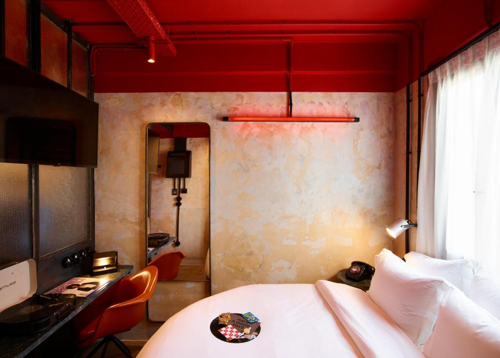 «Τα βιομηχανικού σχεδιασμού δωμάτια του ξενοδοχείου, με τα neon κόκκινα φώτα και τους γυμνούς τοίχους περιμένουν τον επισκέπτη για να του συστήσουν την underground πλευρά της Αθήνας. Κάθε δωμάτιο είναι εξοπλισμένο με vinyl player και δίσκους, ενώ τα ιδιαίτερα t-shirts που διακοσμούν τα δωμάτια θα είναι διαθέσιμα προς πώληση στη reception του ξενοδοχείου», αναφέρουν οι νέοι ιδιοκτήτες του.