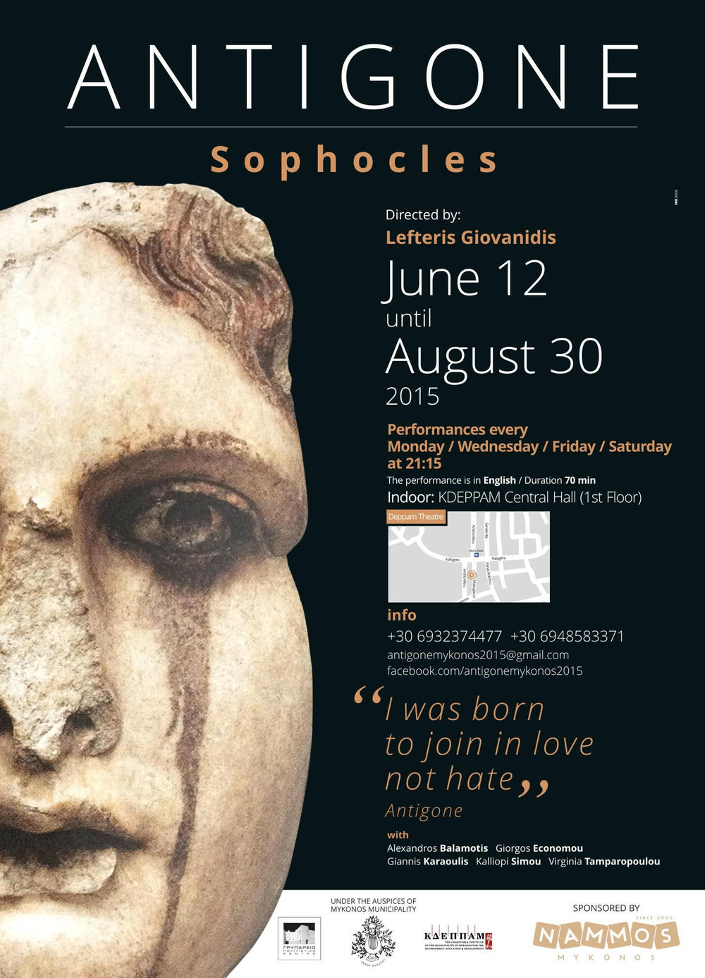 · The play is been performed in Mykonos island, until August 30, on Mondays, Wednesdays, Fridays and Saturdays, at 9.15 pm. It lasts 70 minutes.