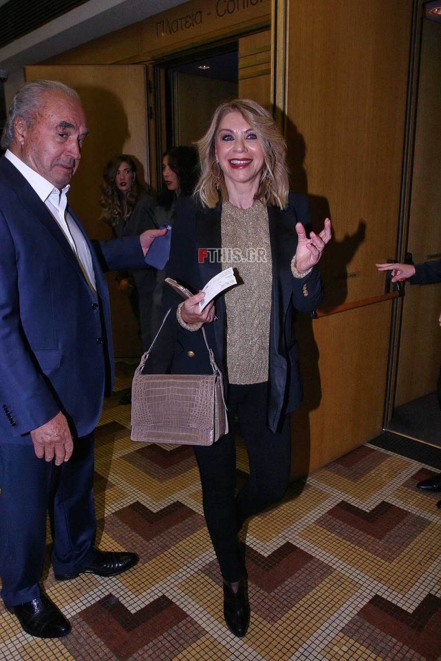 Επέλεξε να φορέσει μαύρο κολάν με μαύρο μακρύ σακάκι, χρυσαφί εντυπωσιακή μπλούζα και ψηλοτάκουνα μαύρα μποτάκια.