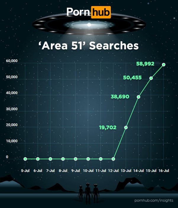 Τώρα το αστείο έχει μεταφερθεί στον κόσμο της πορνογραφίας, καθώς οι στατιστικές του Pornhub δείχνουν ότι οι αναζητήσεις για την Area 51 έχουν αυξηθεί από μηδέν σε 160.000 σε τέσσερις ημέρες (από τις 12 Ιουλίου), με 59.000 αναζητήσεις μόνο στις 16 Ιουλίου.